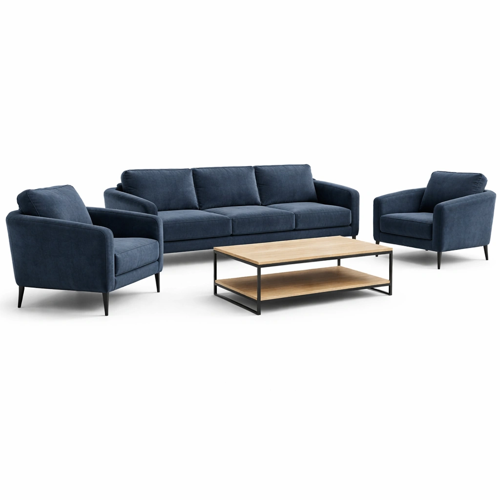 Set di divani in tessuto blu con tavolino in legno e metallo