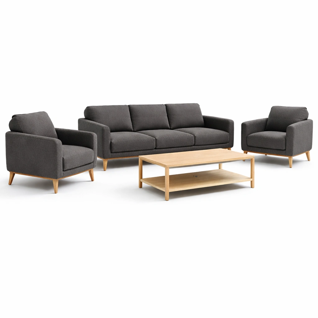 Set di divani in tessuto grigio con struttura in legno e tavolino