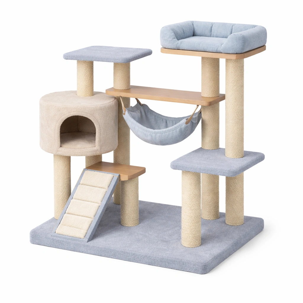 Struttura realizzata in MDF e tessuto di poliestere. Colonne avvolte in corda di sisal per l'affilatura delle unghie dei gatti.